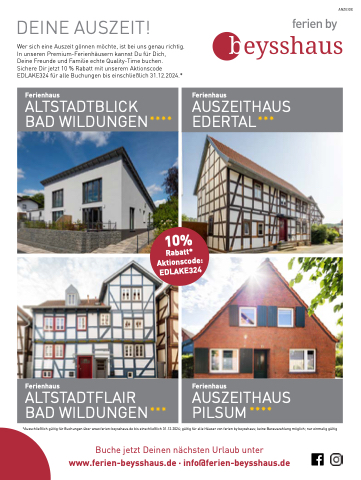 *Ausschließlich gültig für Buchungen über www.ferien-beysshaus.de bis einschließlich 31.12.2024; gültig für alle Häuser von ferien by beysshaus; keine Barauszahlung möglich; nur einmalig gültig