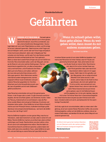 Reisen, in der Gruppe oder zu zweit. Es gibt einerseits sachliche Aspekte, die hier eine Rolle spielen, wie Sicherheit, Kosten, Teilen der Planung. Andererseits ist es wohl bekannt, dass die Men- schen soziale Wesen sind und gerne Erlebnisse, Emotionen und Gedanken teilen wollen. „Ohne Gefährten ist kein Glück erfreulich“, meinte auch der Philosoph Seneca. Außerdem benötigen große Abenteuer eine entsprechende Besatzung – wer kennt die Gefähr- ten aus „Herr der Ringe“ nicht?