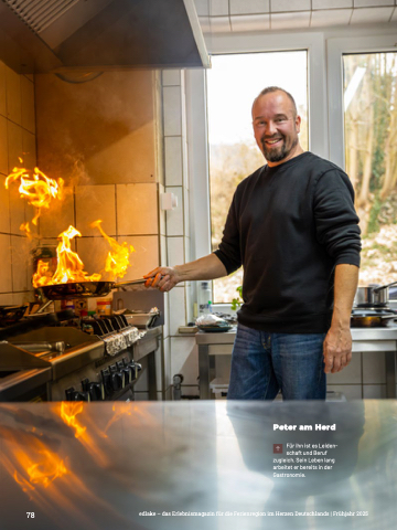 Peter am Herd Für ihn ist es Leiden- schaft und Beruf zugleich. Sein Leben lang arbeitet er bereits in der Gastronomie. 78 edlake – das Erlebnismagazin für die Ferienregion im Herzen Deutschlands | Frühjahr 2025