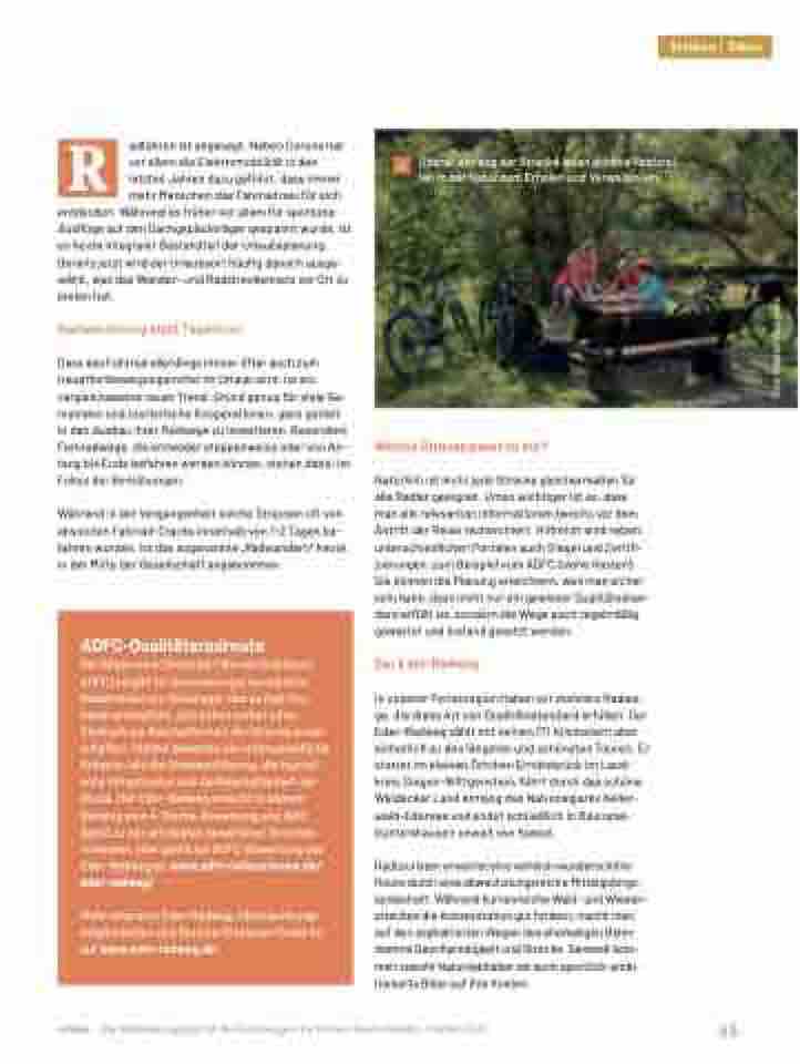 Natürlich ist nicht jede Strecke gleichermaßen für alle Radler geeignet. Umso wichtiger ist es, dass man alle relevanten Informationen bereits vor dem Antritt der Reise recherchiert. Hilfreich sind neben unterschiedlichen Portalen auch Siegel und Zertifi- zierungen, zum Beispiel vom ADFC (siehe Kasten). Sie können die Planung erleichtern, weil man sicher sein kann, dass nicht nur ein gewisser Qualitätsstan- dard erfüllt ist, sondern die Wege auch regelmäßig gewartet und instand gesetzt werden.