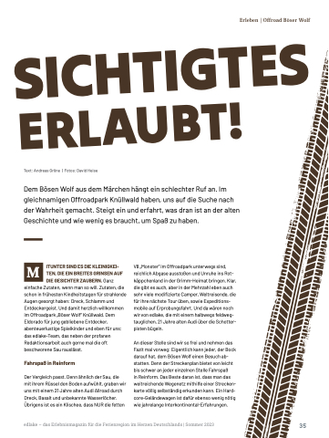 Augen gesorgt haben: Dreck, Schlamm und Entdeckergeist. Und damit herzlich willkommen im Offroadpark „Böser Wolf“ Knüllwald. Dem Eldorado für jung gebliebene Entdecker, abenteuerlustige Spielkinder und eben für uns: das edlake-Team, das neben der profanen Redaktionsarbeit auch gerne mal die oft beschworene Sau rauslässt.