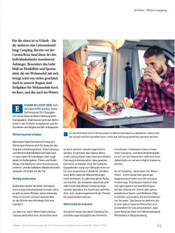 Für die einen ist es Urlaub – für die anderen eine Lebenseinstel- lung: Camping. Bereits vor der Corona-Krise fand diese Art des Individualurlaubs zunehmend Anhänger. Besonders das hohe Maß an Flexibilität und Sponta- nität, die ein Wohnmobil mit sich bringt, wird von vielen geschätzt. Auch in unserer Region sind Stellplätze für Wohnmobile hoch im Kurs, und das auch im Winter.