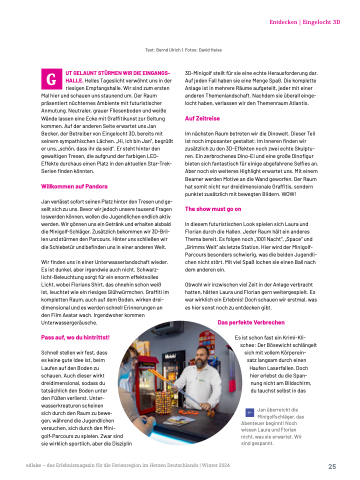 Jan verlässt sofort seinen Platz hinter den Tresen und ge- sellt sich zu uns. Bevor wir jedoch unsere tausend Fragen loswerden können, wollen die Jugendlichen endlich aktiv werden. Wir gönnen uns ein Getränk und erhalten alsbald die Minigolf-Schläger. Zusätzlich bekommen wir 3D-Bril- len und stürmen den Parcours. Hinter uns schließen wir die Schiebetür und befinden uns in einer anderen Welt.