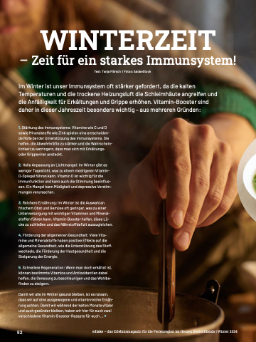 Damit wir alle im Winter gesund bleiben, ist es ratsam, dass wir auf eine ausgewogene und vitaminreiche Ernäh- rung achten. Damit wir während der kalten Monate vitaler und auch gesünder bleiben, haben wir hier für euch zwei verschiedene Vitamin-Booster-Rezepte für euch ...